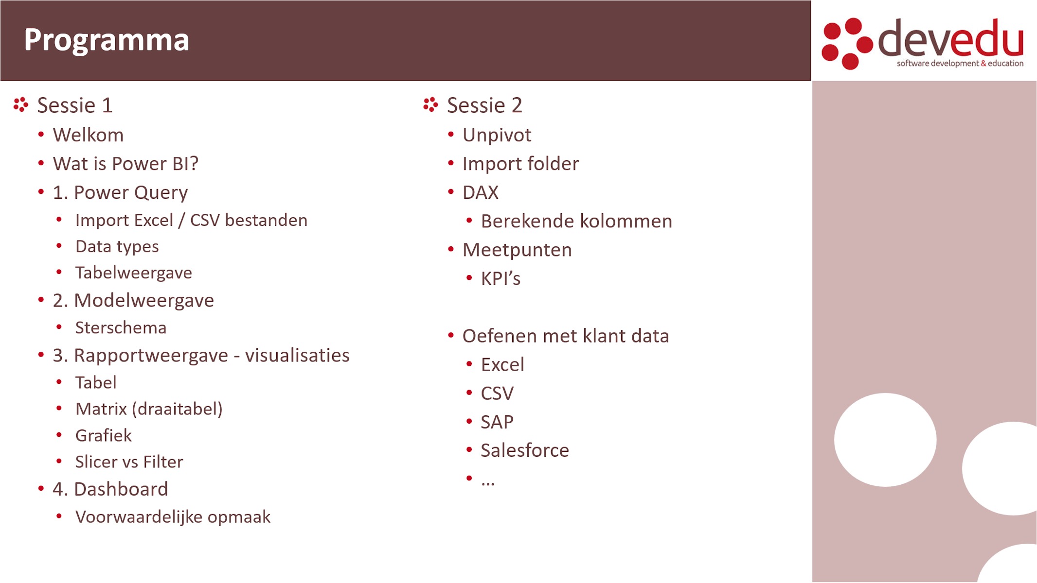 Het streven bij trainingen, die verzorgd worden door Devedu, is dat de te behandelen trainingsstof zoveel mogelijk aansluit bij de dagelijkse praktijk van de deelnemer. Een deel van de training is dan ook op maat in te richten met gebruikmaking van bestanden, overzichten, rapportages en sjablonen uit de prakrijk van de deelnemer of het bedrijf.